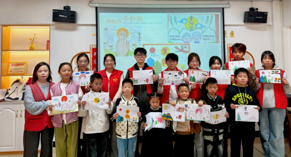 文化润心,更需实践赋能。随后的“大手牵小手”手工活动中,孩子们在志愿者的协助下展开创意绘画。一幅幅稚拙而真诚的作品,勾勒出他们对“孝”与“爱”的理解。活动室内笑语盈盈,秋阳透过窗户,为鲜红的党旗镀上一层温暖的光晕,也映衬着志愿者们朝气蓬勃的脸庞。
