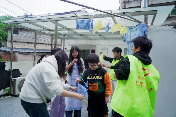 活动现场,非遗蓝染体验为托管班拉开趣味序幕。学生党员与志愿者化身“非遗导师”,先向孩子们讲述蓝染的历史渊源,再拆解“扎、染、晾”核心工序。从折叠白布、捆扎花纹到浸入天然靛蓝染料,志愿者手把手指导,当白布在浸染氧化中浮现出独一无二的纹样时,孩子们满脸惊喜,沉浸式感受古老技艺的匠心魅力。